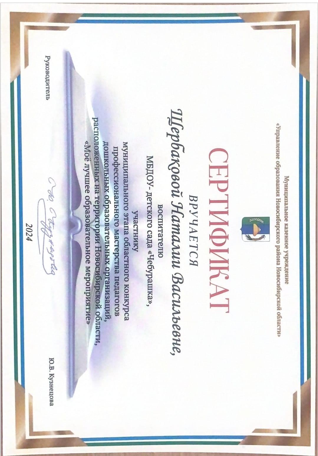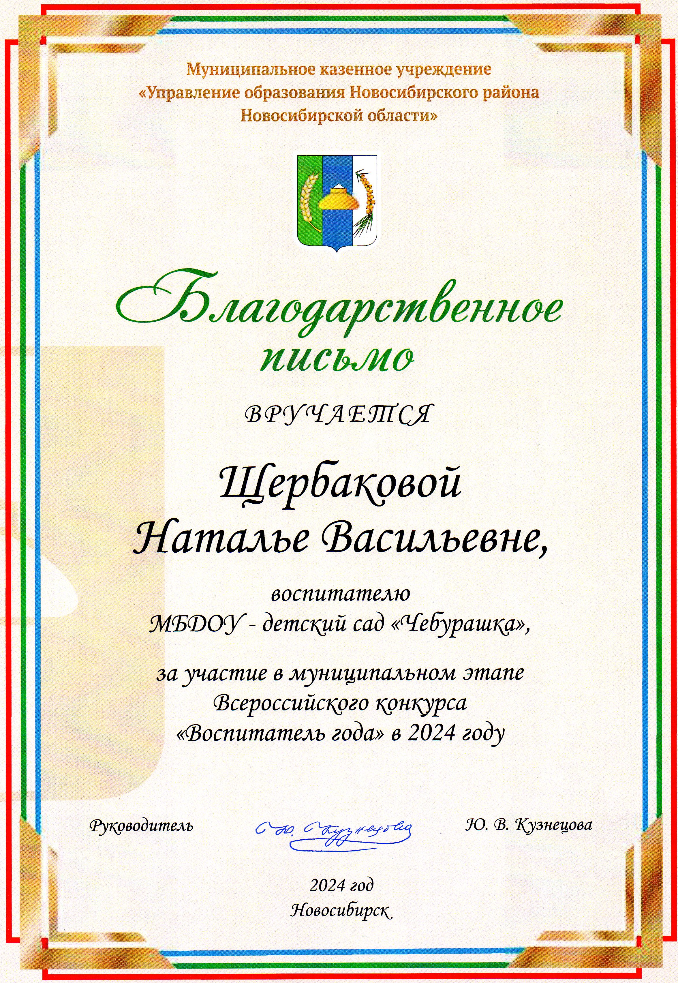 Благодарственное письмо за участие в муниципальном этапе Всероссийского конкурса "Воспитатель года" в 2024 году.