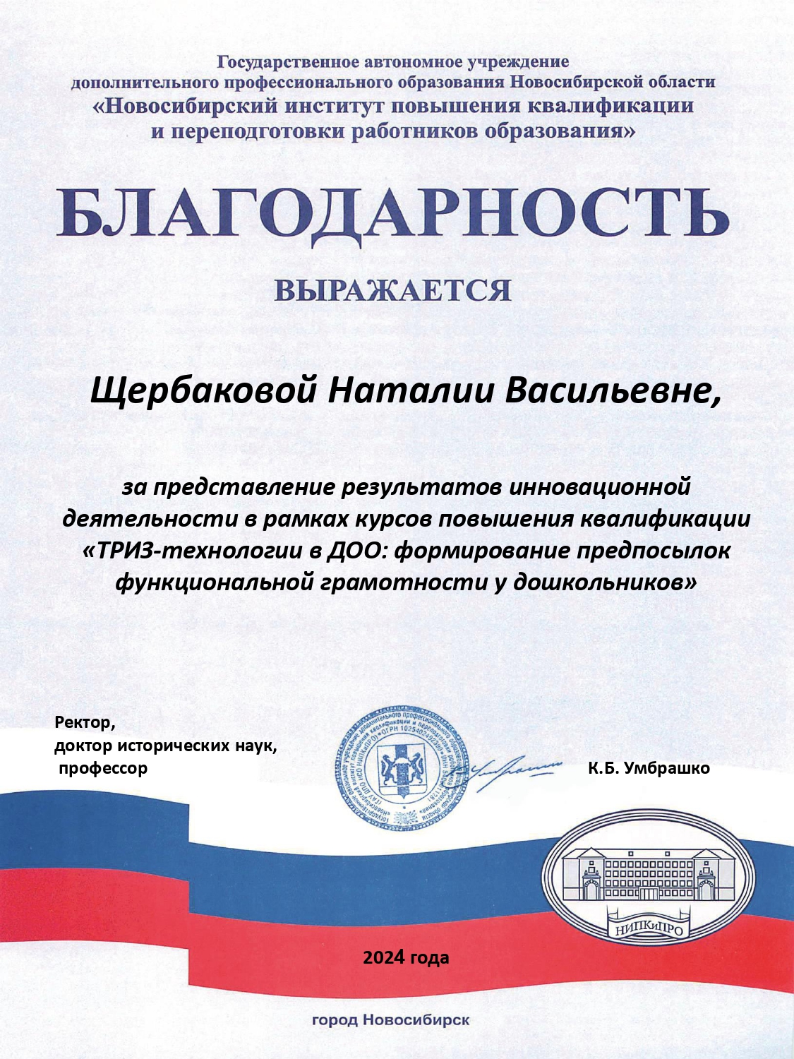 Благодарность за представление результатов инновационной деятельности в рамках курсов повышения квалификации "ТРИЗ-технологии в ДОО: формирование предпосылок функциональной грамотности у дошкольников